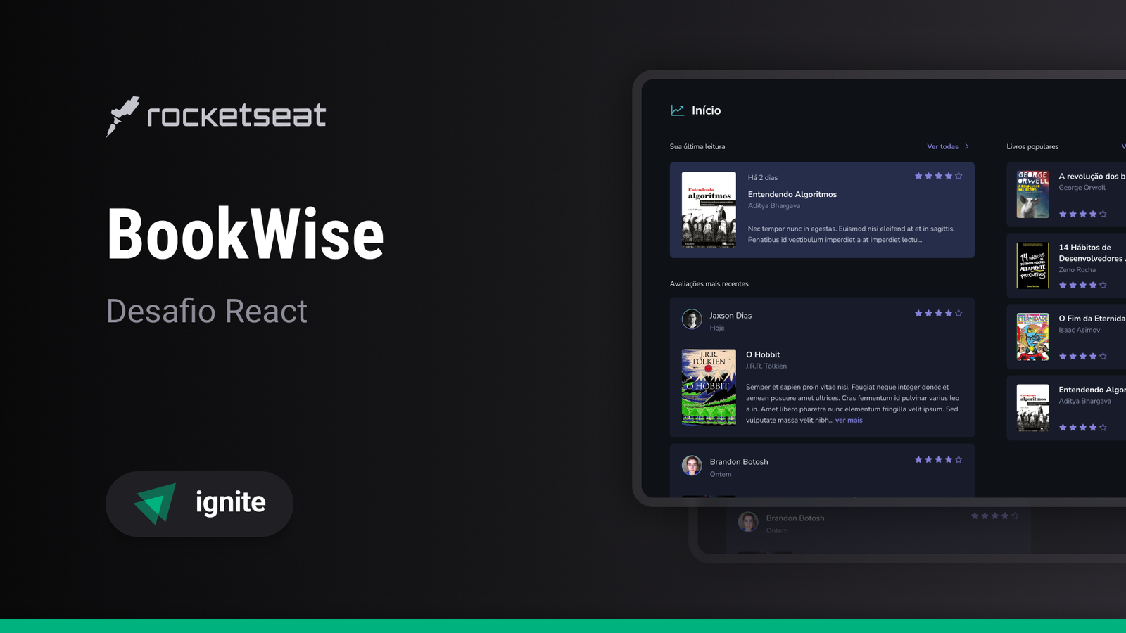 Plataforma de avaliações de livros desenvolvida com Next.js, TypeScript e StitchesJS. Foi utilizado Prisma como ORM e SQLite como banco de dados. As requisições à API foram gerenciadas com React Query e Axios, enquanto a validação de formulários foi feita com Zod. A autenticação de usuários foi implementada com NextAuth, permitindo login via GitHub e Google.